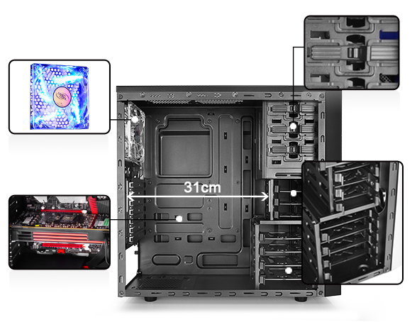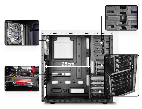 (3.5”) HDD (hidden), 1 x 140 mm LED Fan, 2 x 120 mm, 2xUSB 2.0,